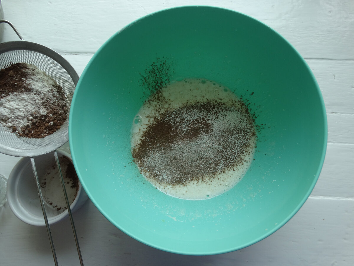 У рідку основу вводимо суху: просіяне через сито борошно, какао і розпушувач. Додаємо суху суміш в 3-4 підходи, і кожен раз лопаткою обережно перемішуємо тісто, щоб не залишилося грудочок.