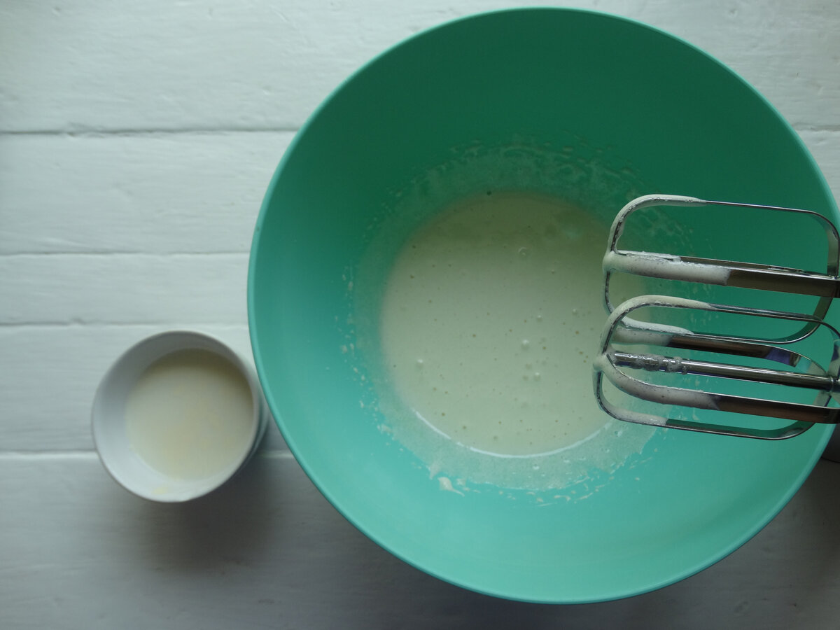 Вливаємо в миску зі збитим в піну яйцем молоко. Збиваємо вміст миски з хвилину. Головне – з’єднати все і домогтися рівної консистенції рідкої основи бісквіта.