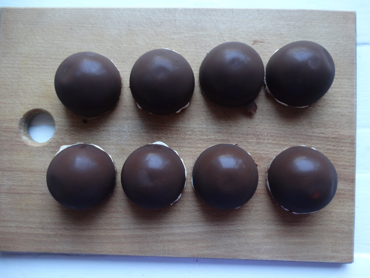 А поки бісквіт остигає, займемося шоколадними сферами. Якщо є форми, це набагато допоможе нам в роботі. Якщо ж форми немає, тоді варто скористатися повітряними кульками. Розтопити шоколад, і вмочити кульки в нього.