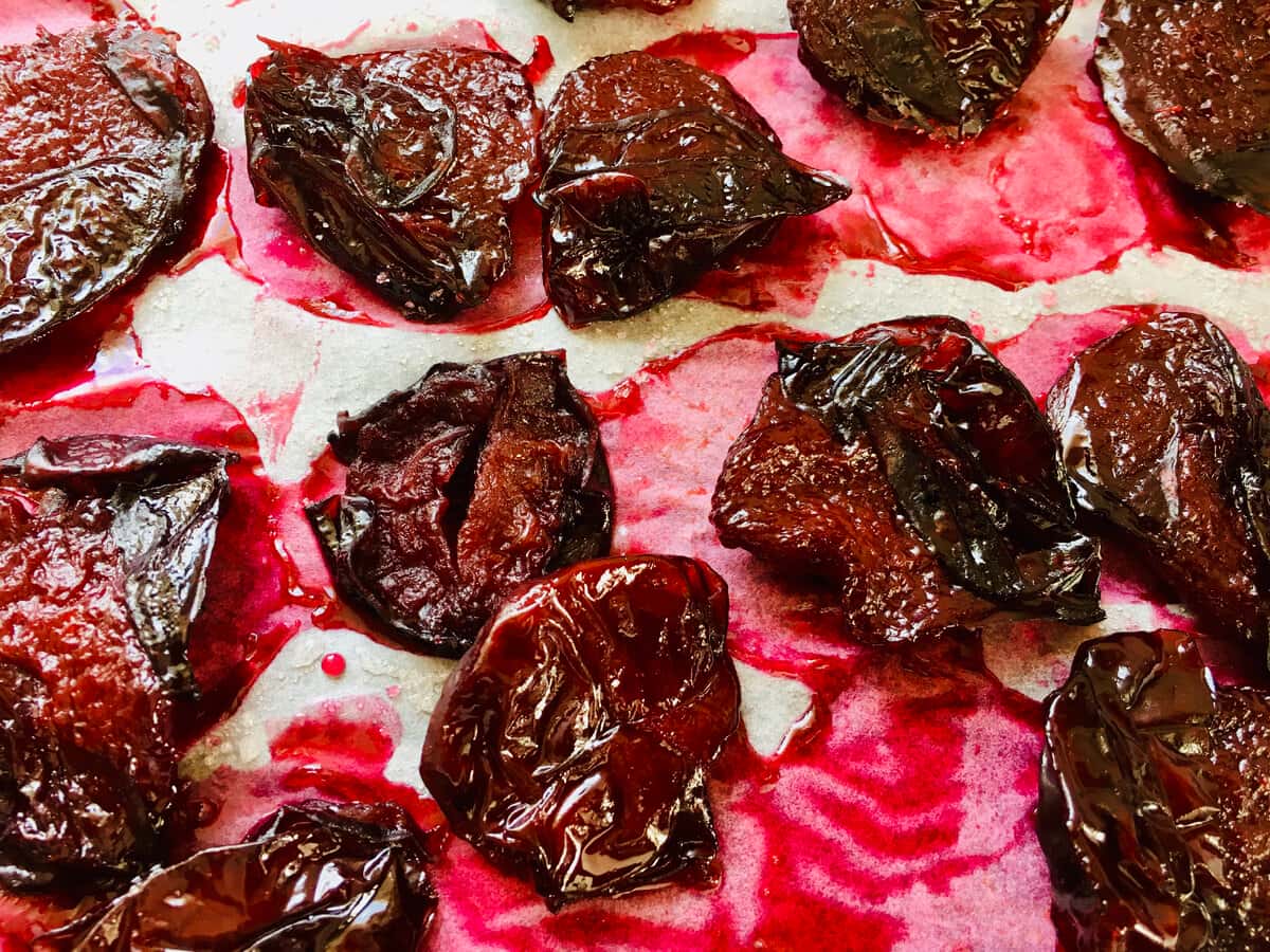Його буває близько 150-170 мл. Він надзвичайно смачний і підходить для приготування морсу або підливи до каш або сиру. Сливи охолоджені перекладаю на пергамент або фольгу, посипавши підкладку цукром. Ставлю деко з сливами в духовку на 1 годину при температурі 80-90 градусів.