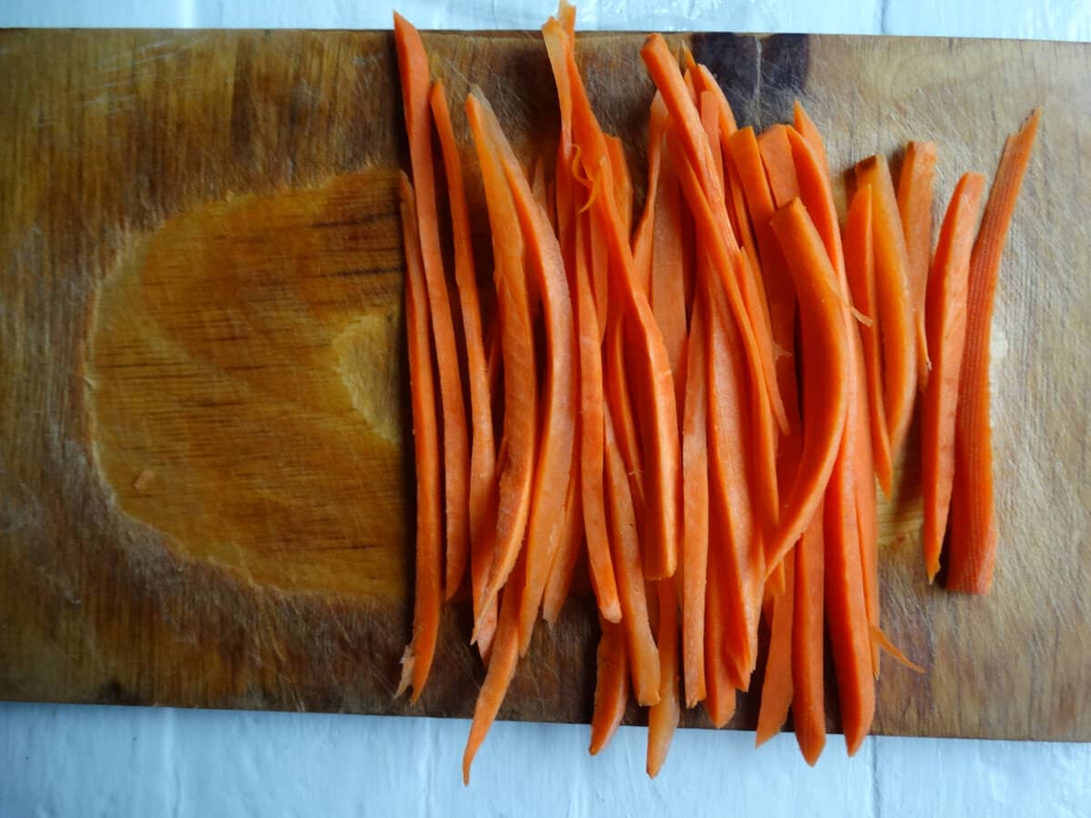 Готову морквину нарізаємо на тонкі довгі шматочки.
