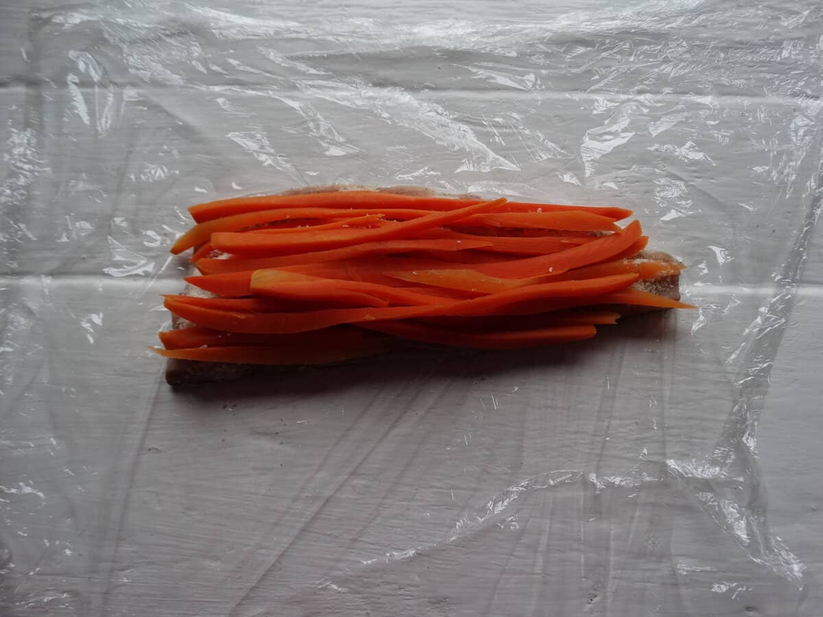 Формуємо страву. На шматочок рибки, яку ми виклали на плівку, кладемо шар морквини.