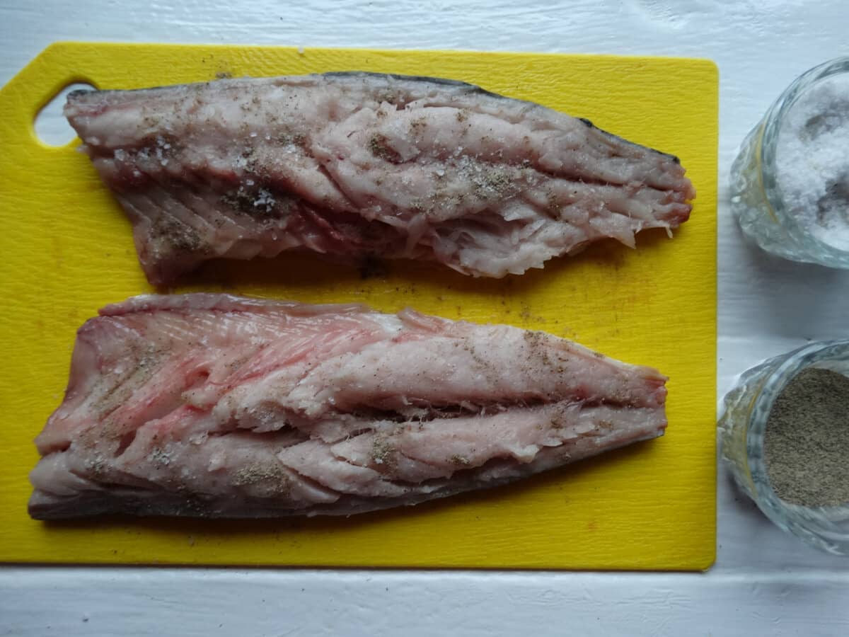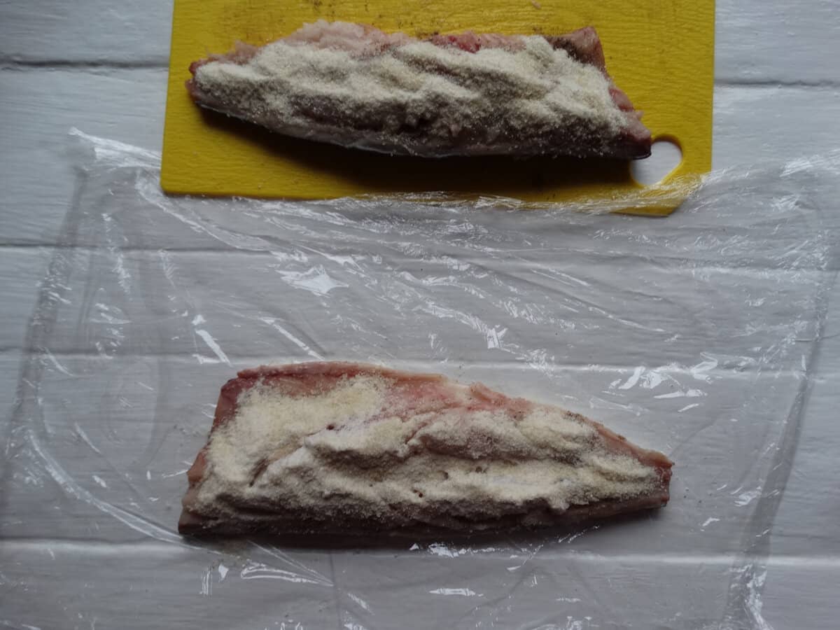 Одну половинку рибки кладемо на харчову плівку. Посипаємо желатином одне і друге рибне філе.