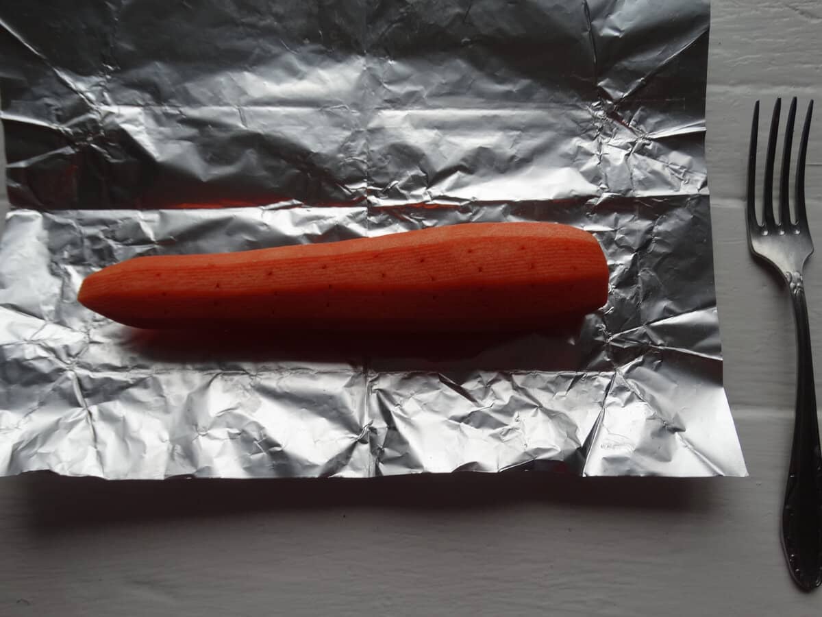 Почнемо з того, що відправимо моркву в піч. Запікаємо її 20-25 хвилин, поки морква не стане м’якою ( перевіряємо, протикаючи зубочисткою ).