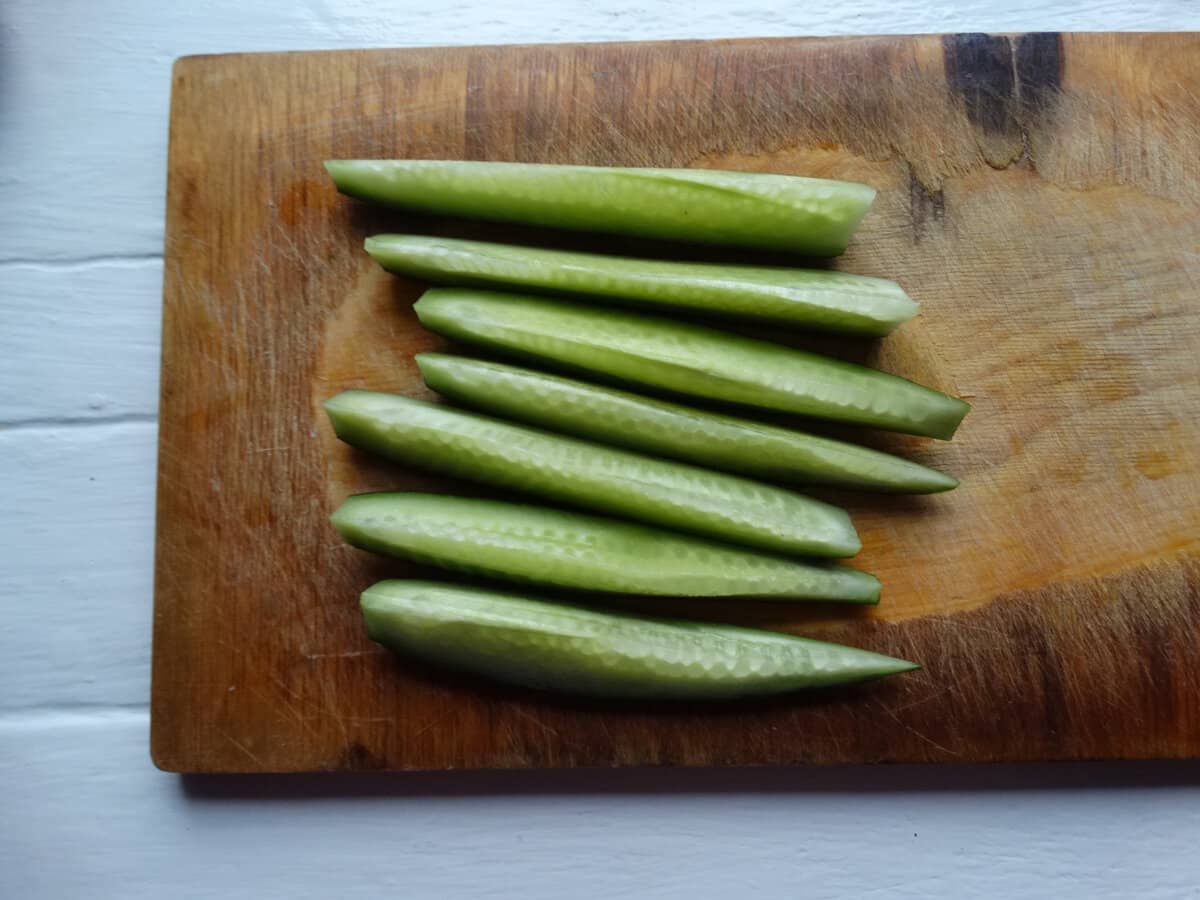 Нарізаємо огірки. І знову, тут – повна свобода. Можна нарізати слайсами, але красивіше виглядає готова страва з ось такими трикутними шматочками.