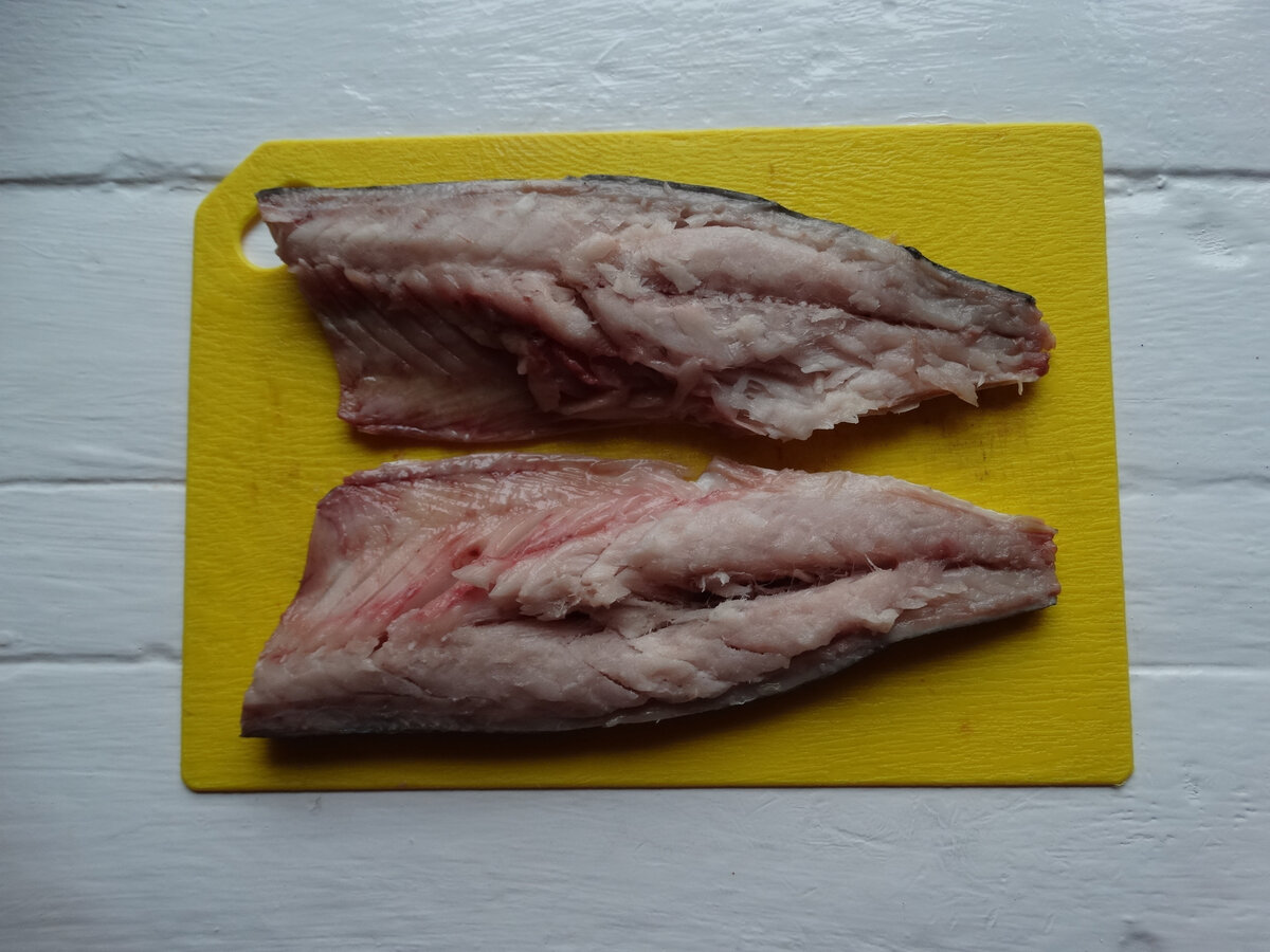 Готуємо рибу: відділяємо голову і хвіст, видаляємо кісточки і нутрощі. А ось шкурку залишаємо. Так і філе ціліше буде. Та й в готовій страві шкірка добре провариться, стане м’якенькою.