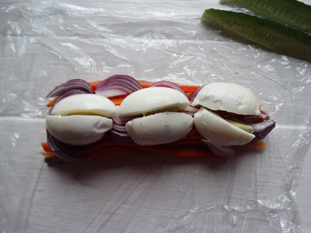 У мене на етапі огірків конструкція стала розвалюватися. Тому я поспішила накрити огірковий шар другим рибним філе і перемотати всю конструкцію плівкою.