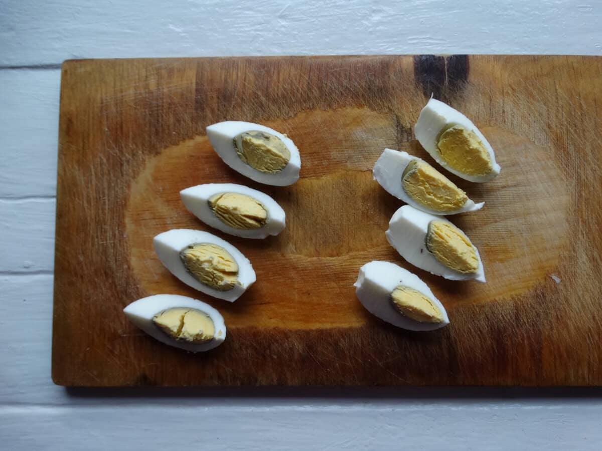 Яйця нарізаємо. Якщо це – перепелині яйця, їх можна взагалі не розрізати, або тільки навпіл. Курячі – навпіл або на четвертинки.