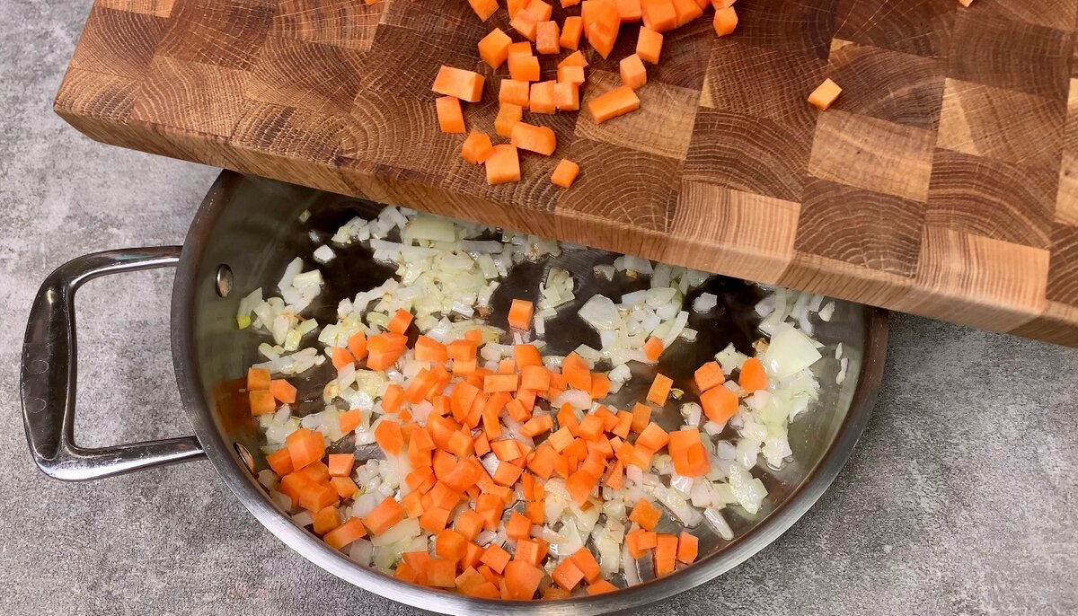 3. У сковороду відправляємо цибулю кубиком, обсмажуємо до золотистості, потім додаємо моркву кубиком і готуємо ще 3-4 хвилини.