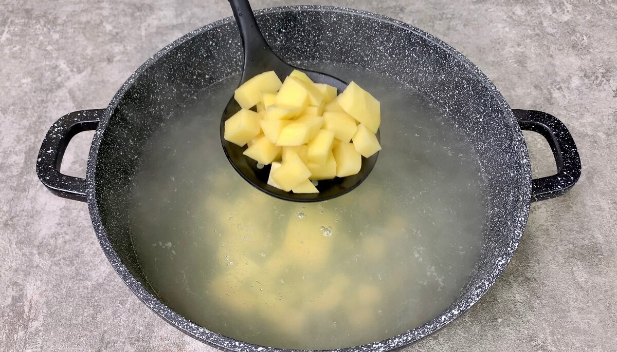1. Каструлю з водою або бульйоном ставимо на вогонь, доводимо до кипіння, потім закладаємо нарізану картоплю, доводимо до кипіння і варимо 5 хвилин.