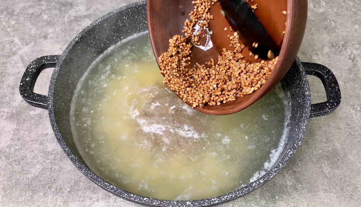 2. Через 5 хвилин всипаємо як слід промиту гречку, солимо і варимо з моменту закипання ще 10 хвилин.