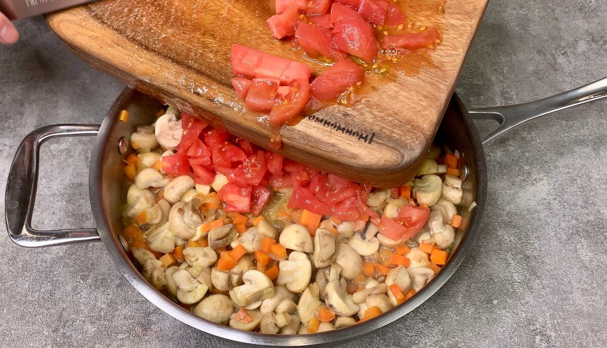 4. Далі додаємо нарізані печериці, тушкуємо 2-3 хвилини, потім відправляємо в сковороду нарізані помідори, очищені від шкірки і готуємо ще буквально 3-4 хвилини.