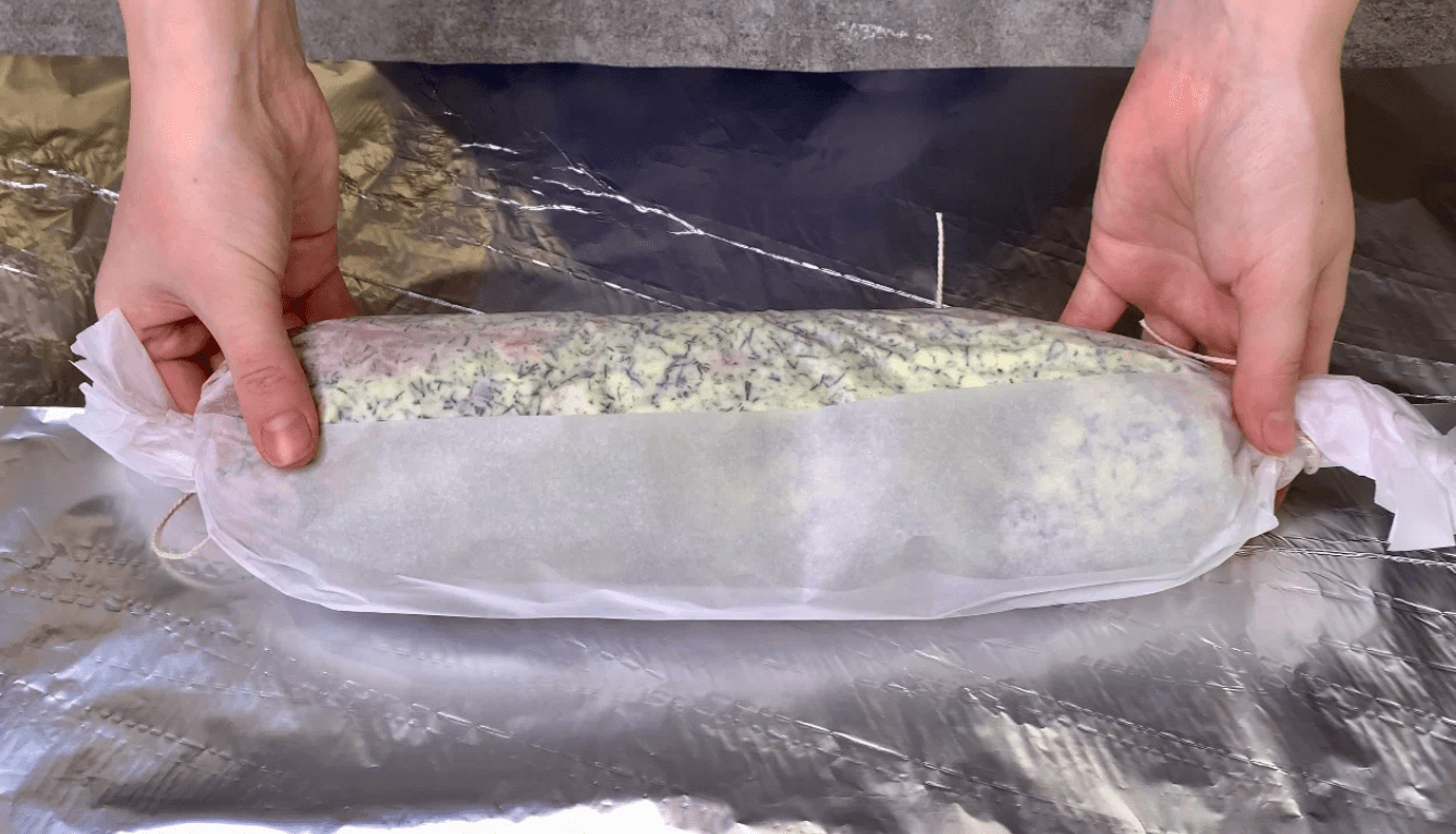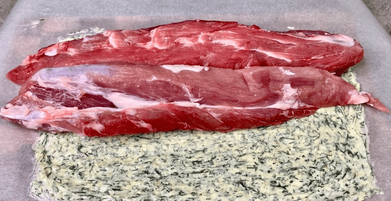 3. Викладаємо вирізку, максимально щільно загортаємо в рулет і з обох боків зав’язуємо кулінарним шпагатом.