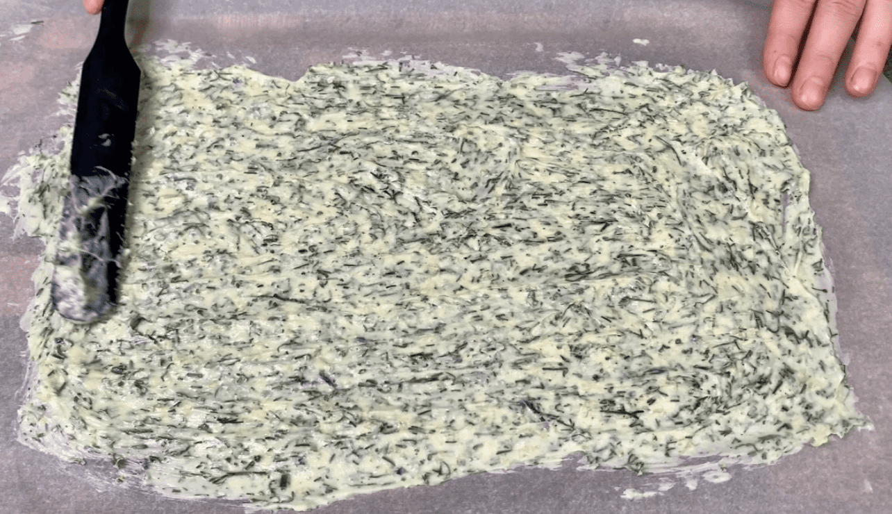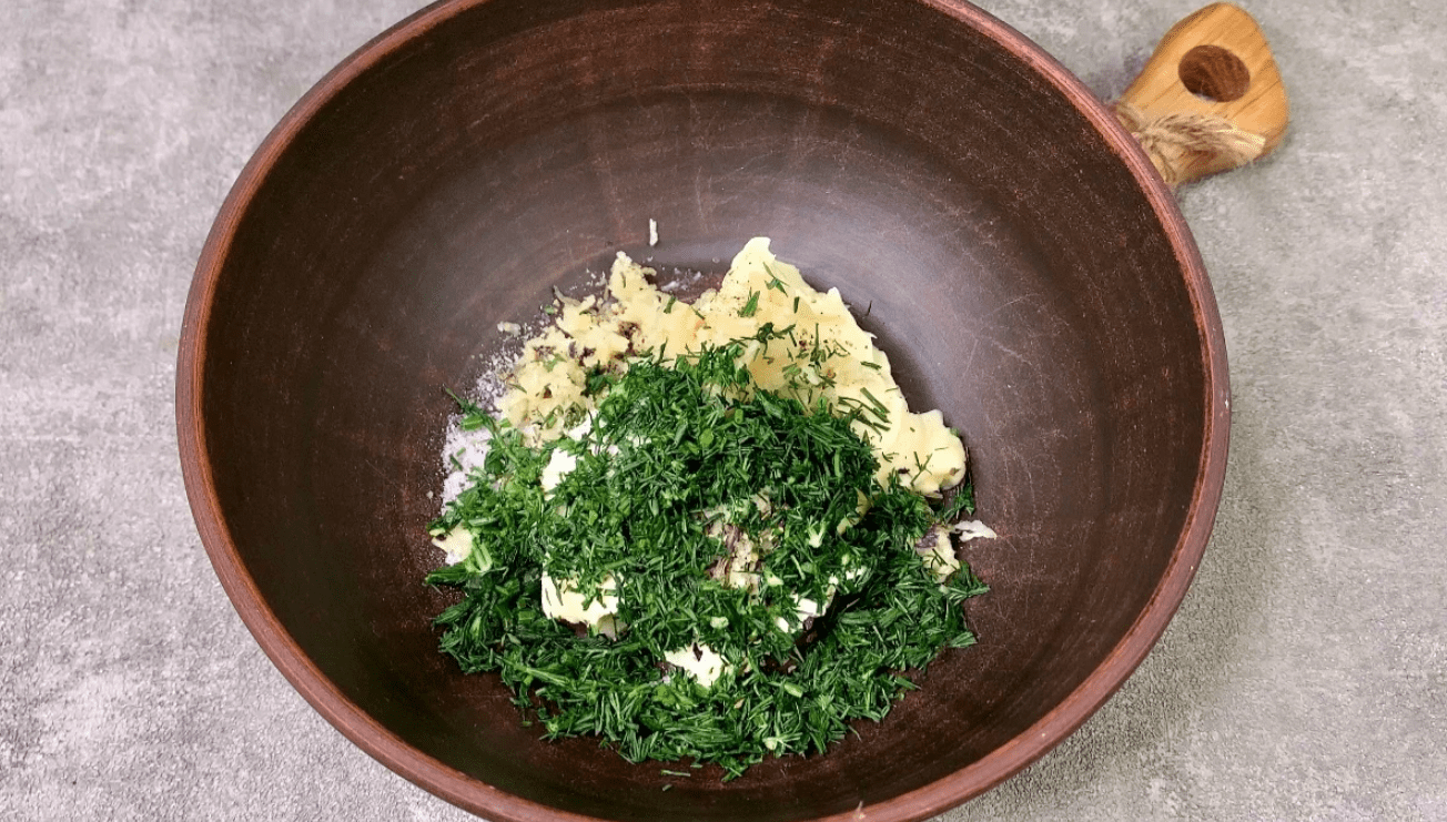 1. Змішуємо розм’якшене вершкове масло, орегано, сушений базилік, тертий часник, рубаний кріп, сіль та чорний мелений перець.