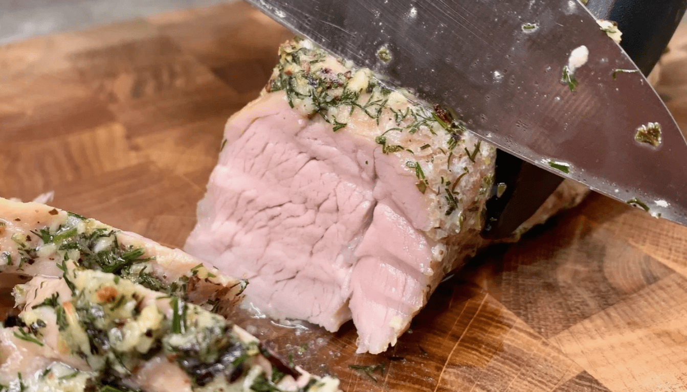 На фото край трохи сирий, тому що я запікала відразу дві вирізки впритул один до одного. Сирий тільки край, тому за 10-15 хвилин, що залишилися, м’ясо повністю дійде до готовності. Якщо запікати одну вирізку, такого не буде.