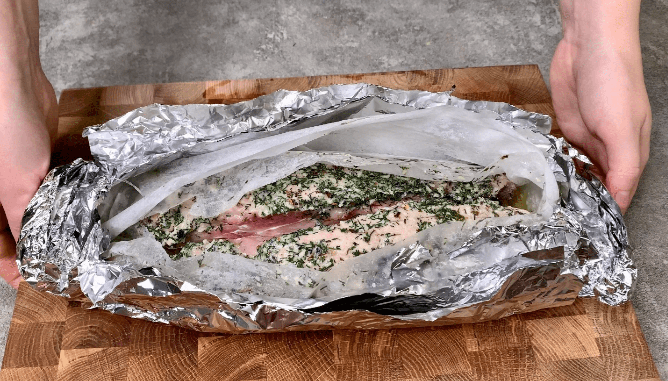 4. Далі також щільно загортаємо в кілька шарів фольги і відправляємо в розігріту до 200 градусів духовку на 30 хвилин.