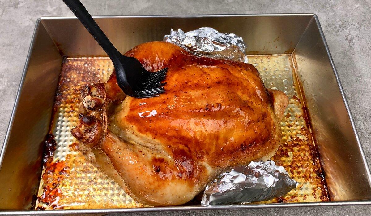 4. Пов’язуємо ніжки кулінарним шпагатом і відправляємо курку в розігріту до 180 градусів духовку на 25 хвилин. Після дістаємо, закриваємо крила фольгою і повертаємо в духовку. Далі, в процесі приготування кожні 25-30 хвилин дістаємо і рясно змащуємо соком, що виділився.