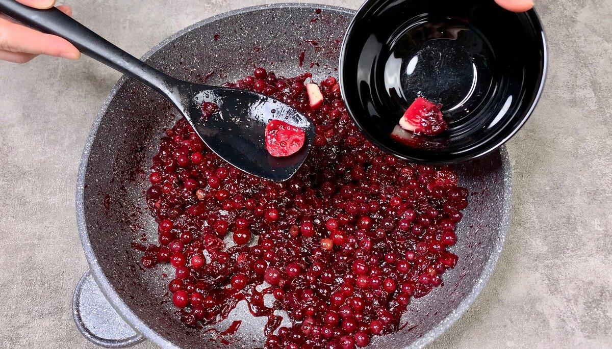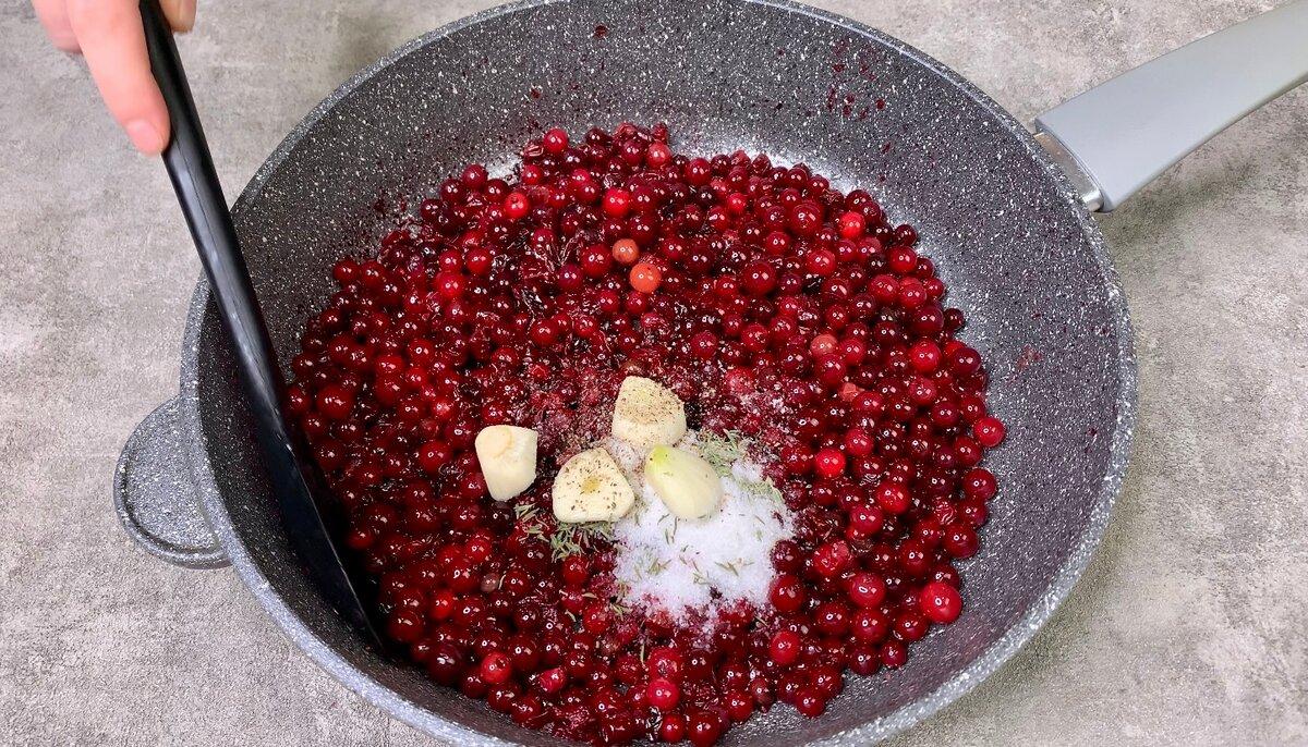 5. Журавлину відправляємо в сковороду з невеликою кількістю олії і прогріваємо на середньому вогні до виділення рідини. Потім додаємо цукор, сіль, чорний мелений перець, сушений чебрець, пластини часнику і тушкуємо під кришкою 7-8 хвилин.