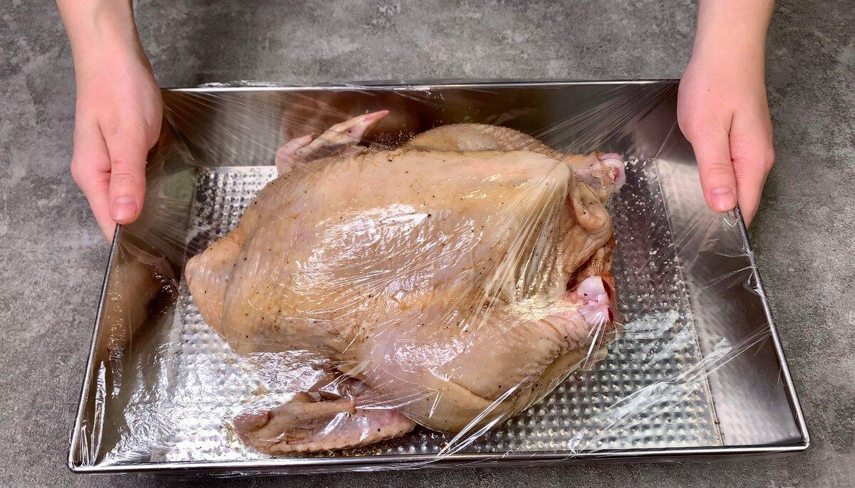 2. Через дві години дістаємо, знову злегка поливаємо соєвим соусом, збризкуємо винним оцтом і ретельно натираємо з усіх боків будь-яким гострим соусом або аджикою. Після накриваємо харчової плівкою і залишаємо маринуватися ще на 2 години. За цей час курку один раз необхідно буде перевернути.