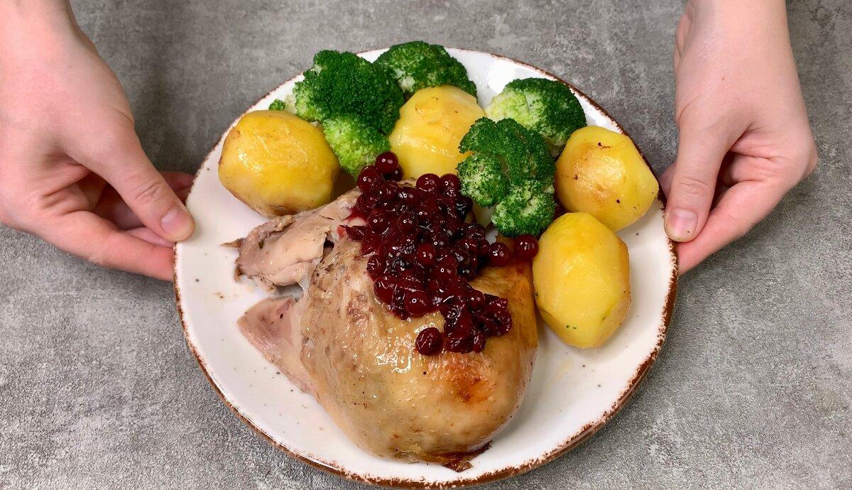 Ви тільки подивіться, які кольори зібрані в цій страві! Виглядає не інакше, як на мільйон! ) Апетитно, яскраво і, дійсно, святково! Поєднання злегка кислого журавлинного соусу з куркою і гарнірами чудове. Впевнена, що ця страва припаде до смаку багатьом, вже дуже тут все гармонійно і смачно!