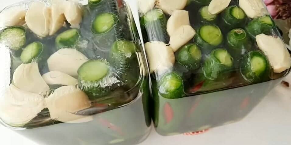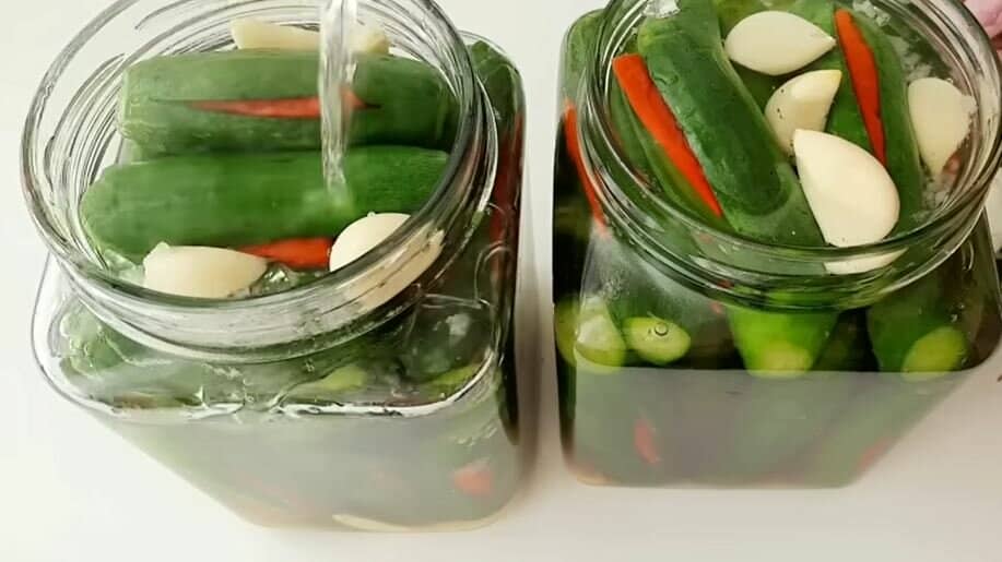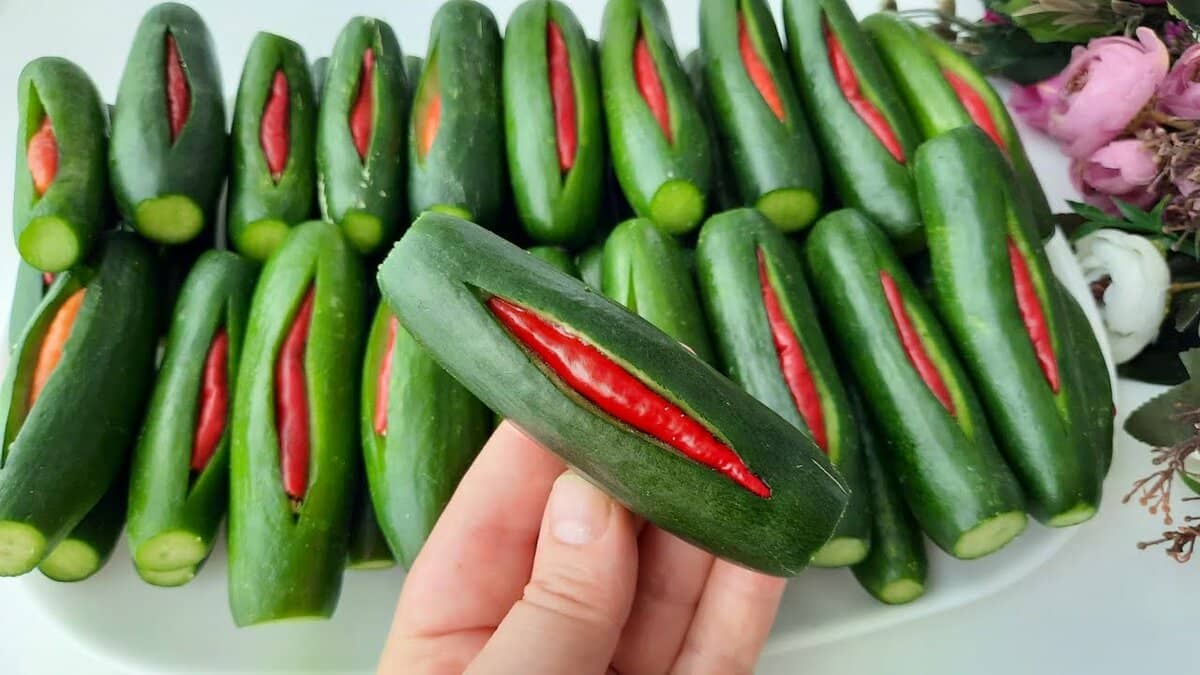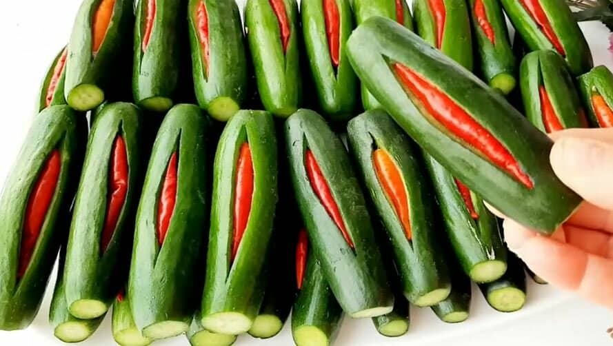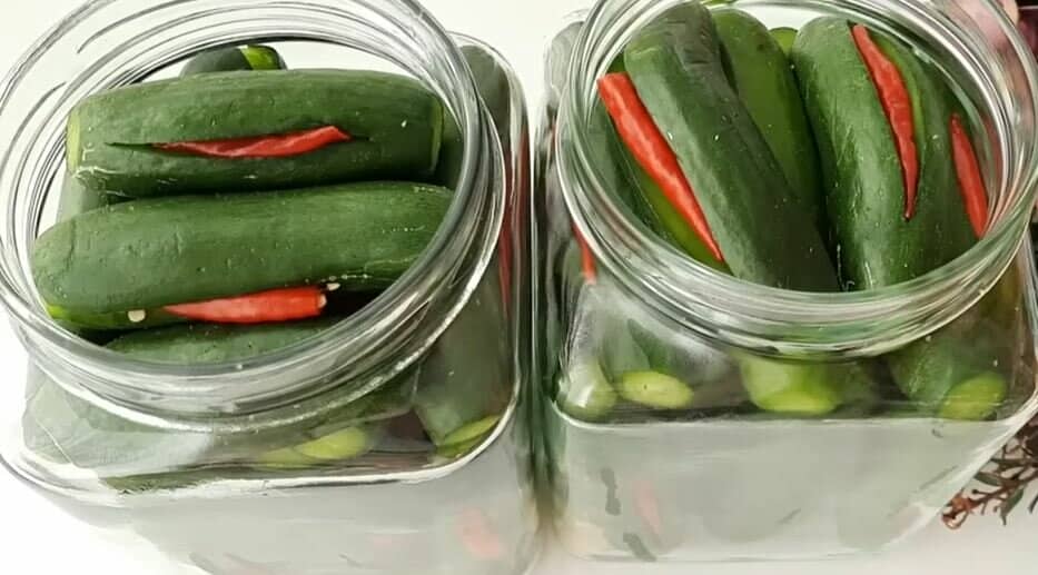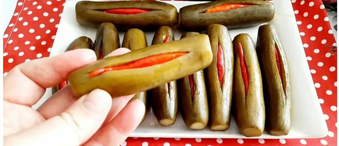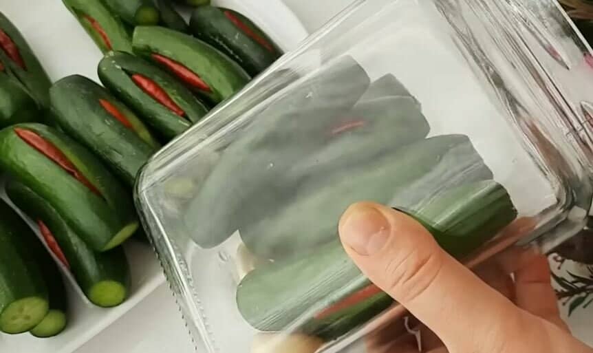 У кожну кишеньку огірка кладемо по одному перчику чилі.