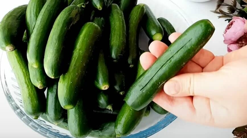 Обрізаємо у огірків “попки” і робимо надрізи вздовж огірка, не доходячи до країв, як кишеньки.