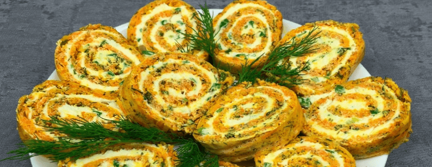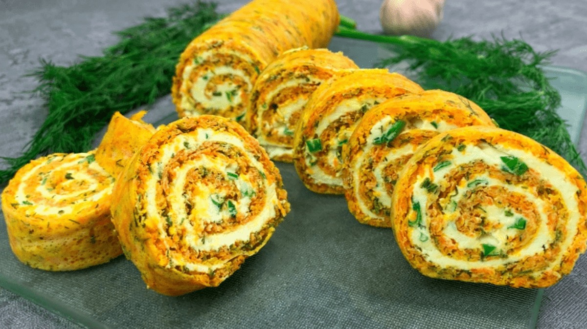 Яскрава та корисна закуска до святкового столу і не тільки із простих інгредієнтів! Дуже смачний, ніжний та оригінальний морквяний рулет припаде до смаку та займе гідне місце закуски на будь-якому столі.