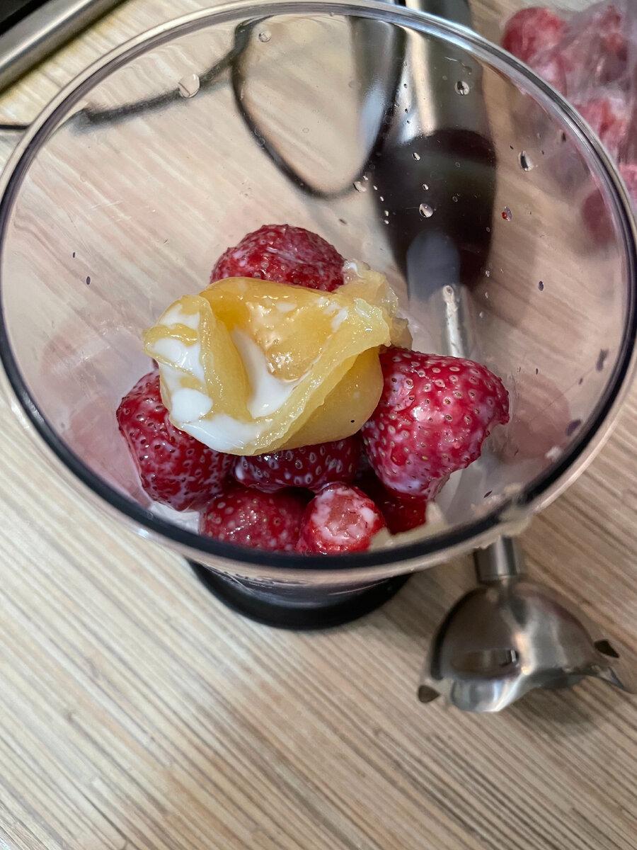 Крок 2. До банана додаємо полуницю. При покупці замороженої полуниці звертайте особливу увагу на наявність льоду на ягодах, якщо лід є і його багато, то це означає, що полуницю кілька разів розморожували або неправильно зберігали. Якщо ви не хочете холодний смузі або готуєте для дітей, тоді краще розморозити полуницю, попередньо дістаньте з морозильної камери, щоб полуниця розморозилася і пустила сік (25-30 хвилин достатньо для того, щоб полуниця розморозилася).