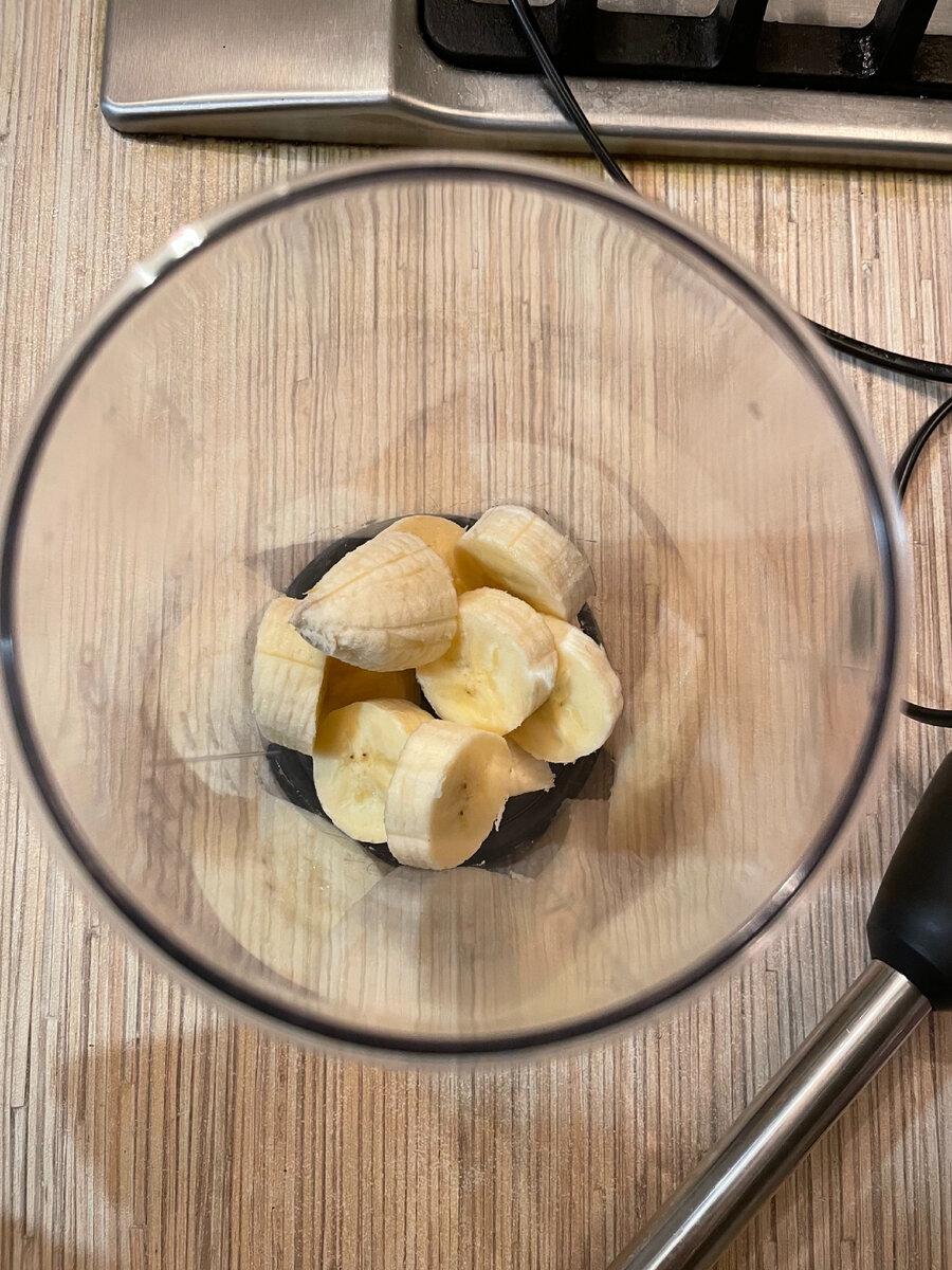Крок 1. Банан очищаємо від шкірки, ріжемо його невеликими шматочками і кладемо в чашу для блендера