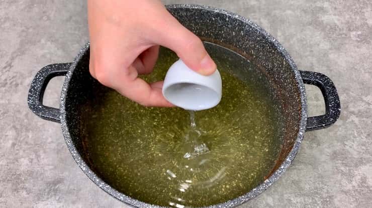 Як тільки все розчинилося, знімаємо каструлю з вогню, вливаємо оцтову есенцію і добре перемішуємо.