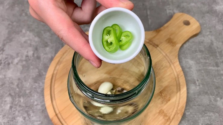 У сухі чисті баночки закладаємо лавровий лист, горошини чорного перцю, запашний перець, пластини часнику та кільця гострого перцю.