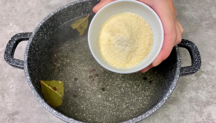 - Засипаємо в каструлю швидкорозчинний желатин, мішаємо до розчинення та повної однорідності. Далі ставимо на вогонь і доводимо маринад до перших бульбашок. Кип’ятити не треба! Як тільки з’являться бульбашки, відразу ж прибираємо каструлю з вогню!