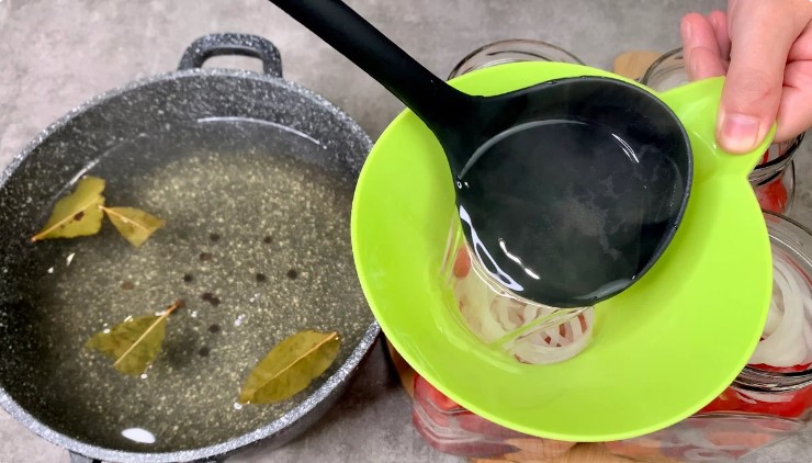 - У каструлю з водою всипаємо цукор, сіль, ставимо на вогонь, мішаємо до повного розчинення, потім додаємо лавровий лист, чорний перець горошком, доводимо до кипіння, варимо 2-3 хвилини і відразу прибираємо з вогню.