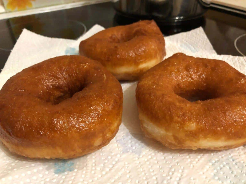 Готові пончики складаємо на паперовий рушник, щоб зайвий жир ввібрав.