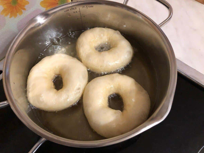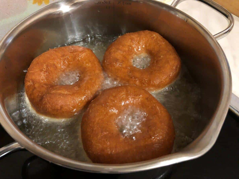 Заготовки пончиків відправляємо в каструлю з розігрітою олією. Сильно олію не розігрівайте, щоб пончики не горіли зовні і встигали прожарюватися. Обсмажуємо з двох сторін до золотистого кольору. Можна перевертати кілька разів.