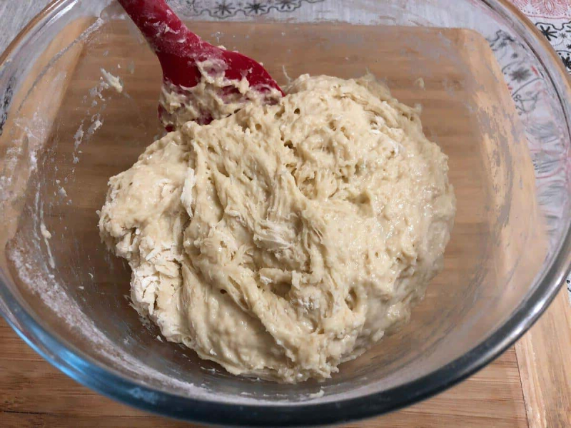 Тепер поступово вводимо залишилося борошно. Борошно обов’язково просіюємо! Перемішуємо тісто спочатку в мисці. Воно повинно бути дуже м’яким і липким. У цьому запорука справжніх повітряних смачних пончиків!