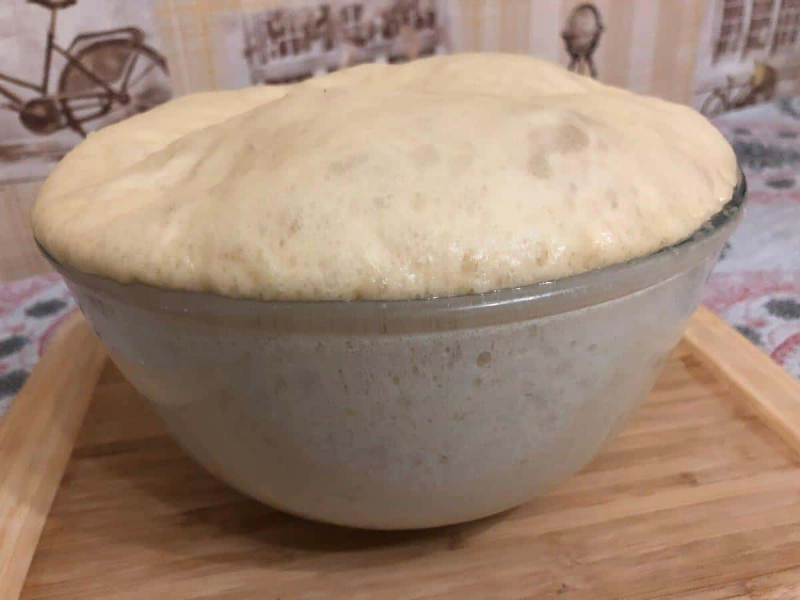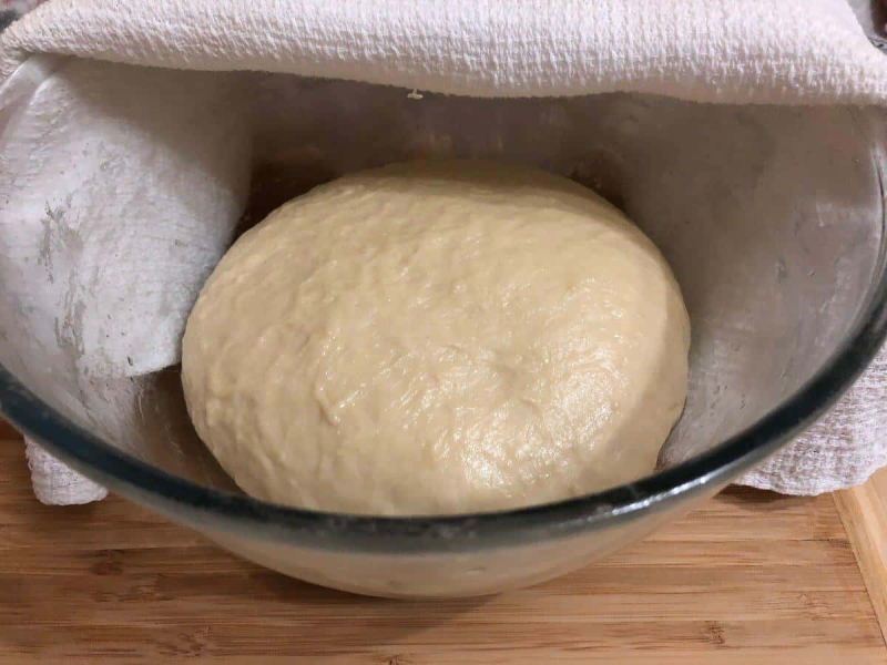 Тепер змащуємо руки олією, формуємо з вимішаного тіста кульку і укладаємо в миску, накриваємо харчовою плівкою і прибираємо в тепле місце для підйому. Тісто має збільшитися вдвічі. Зазвичай це займає 1,5 години.