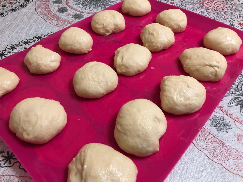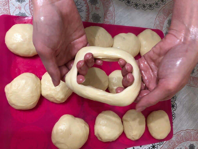 Після другого підйому тісто не обминаємо. Робочий стіл змащуємо олією і викладаємо на нього наше тісто. Від тіста відщипуємо порційні шматочки, намагаючись не травмувати тісто, і формуємо кульки.