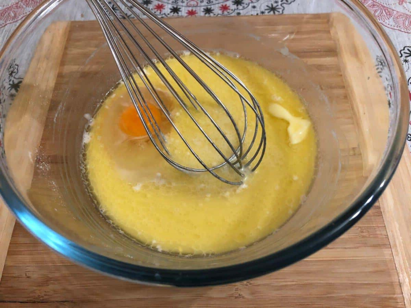 Потім сюди додаємо розтоплене вершкове масло, 1 яйце і сіль. Ще раз добре перемішуємо.
