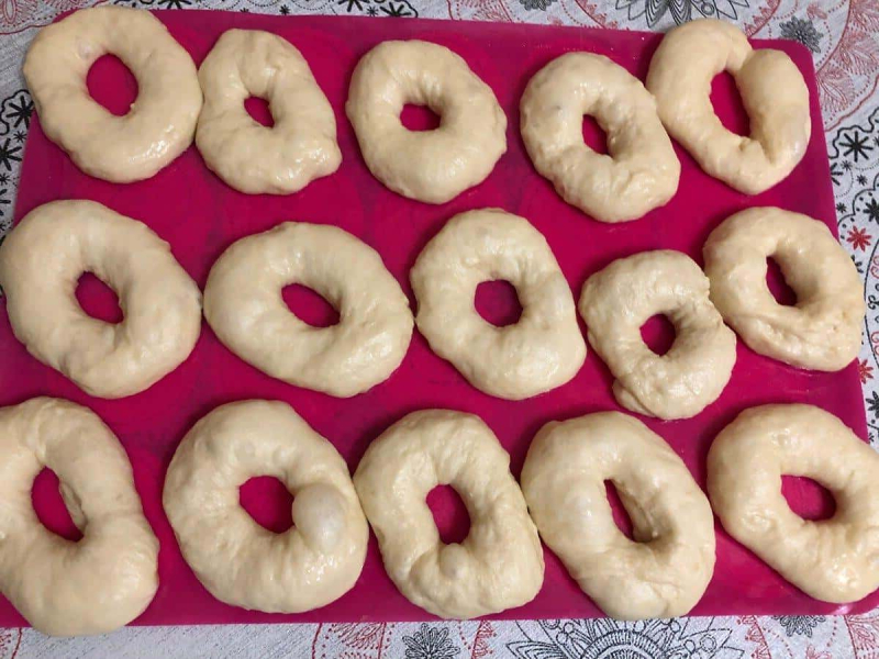 Тепер, за допомогою пальців, проробляємо в середині пончика дірочку і розтягуємо тісто в сторони. Так робимо всі заготовки пончиків.