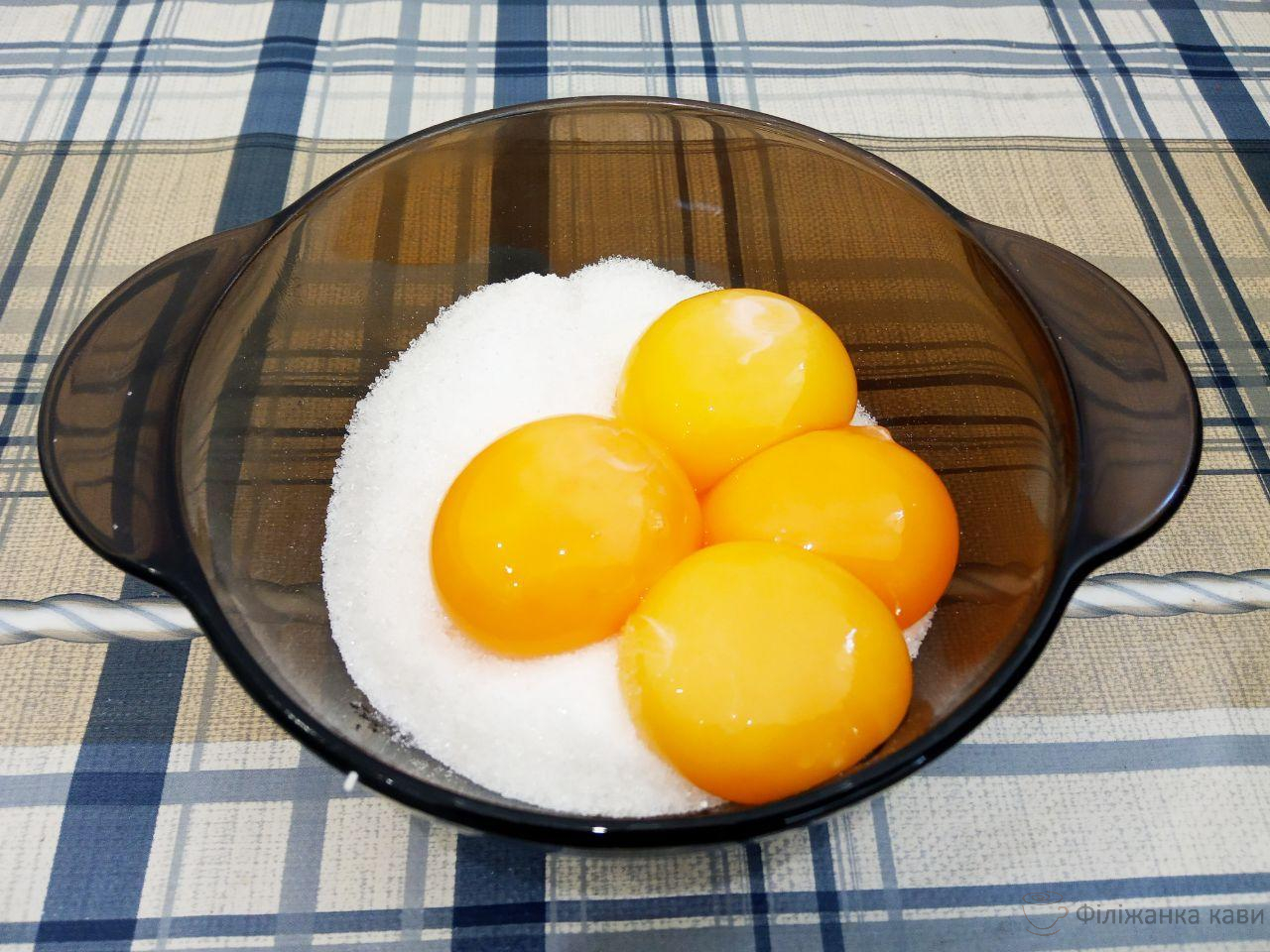 3. У жовтки всипаємо цукор і сіль, ретельно розтираємо.