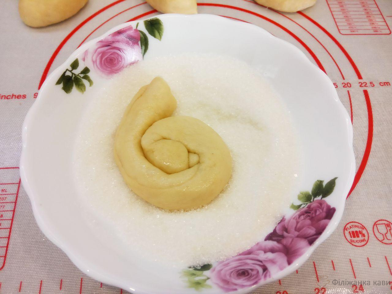 13. Булочку занурюємо в цукор і укладаємо на застелений пергаментом деко.