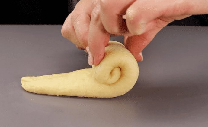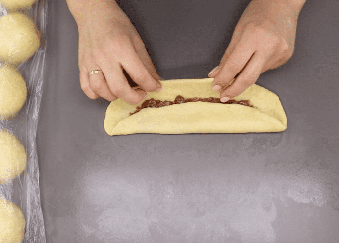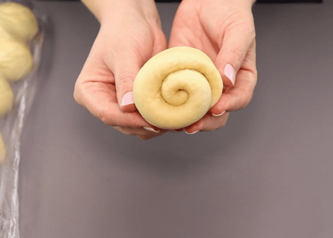 12. Злегка розтягуємо заготівлю, приплющуємо і скручуємо «равликом». Ось така виходить гарна булочка!