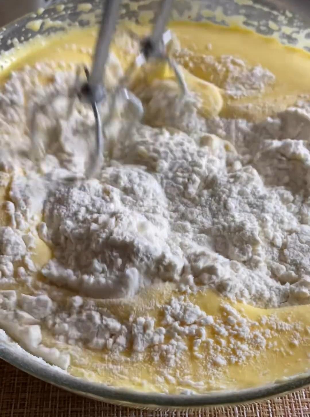 - Додаємо борошно з розпушувачем, що просіюємо, збиваємо.