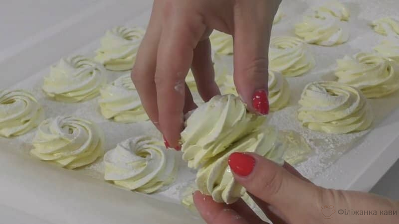 11 сформованим половинкам зефіру дайте застигнути протягом 6 годин. Дві застиглі половинки зефіру з’єднайте і обваляйте в цукровій пудрі. Те ж повторіть з усіма заготовками. Смачного!