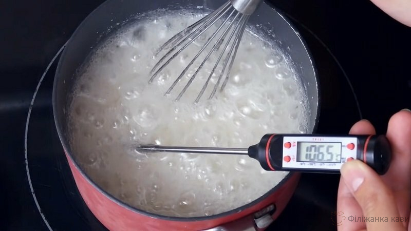 Коли сироп під час проби почне утворювати нитку, знімайте його з вогню. Але не припиняючи збивати пюре, вводите сироп тонкою цівкою в чашу блендера.