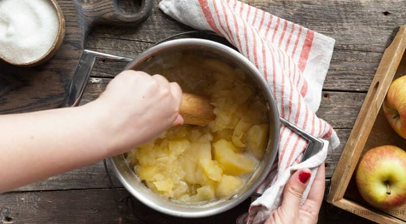Додавши 1 ст. ложку води, перемішайте масу і поставте каструлю на вогонь. Тушіть вміст під кришкою на повільному вогні до тих пір, поки яблука не стануть м’якими.