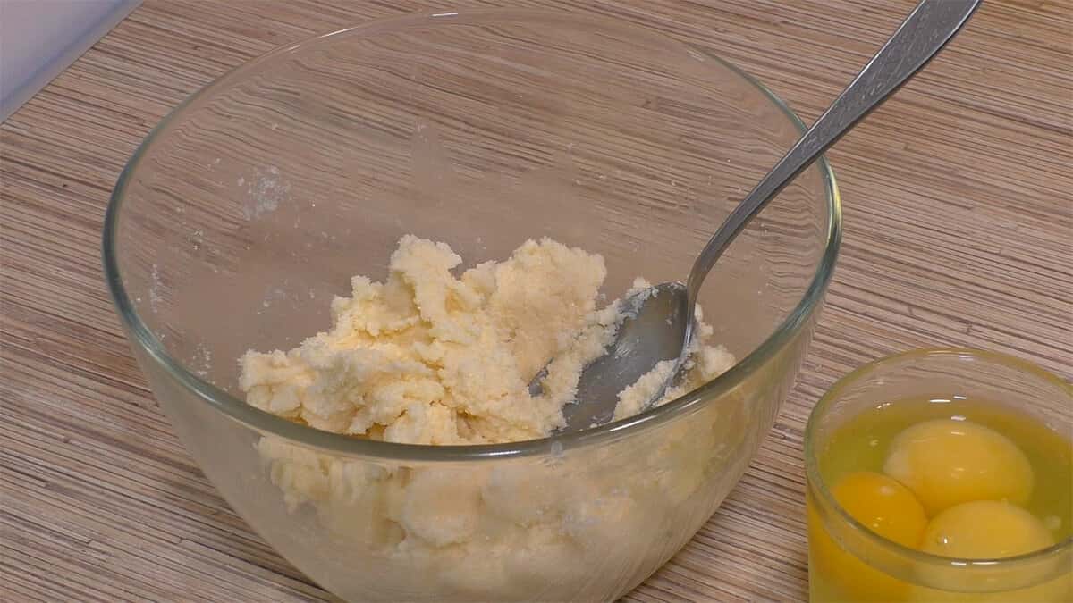 Розм’якшене вершкове масло розтираємо з цукром і ванільним цукром. За допомогою вінчика або ложки збивати міксером не потрібно.