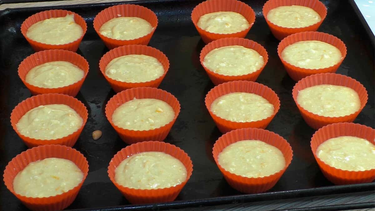Змащуємо формочки олією або вершковим маслом, разом з бортиками. Далі включаємо духовку на 180 градусів і поки вона розігрівається ми наповнюємо наші формочки тістом.