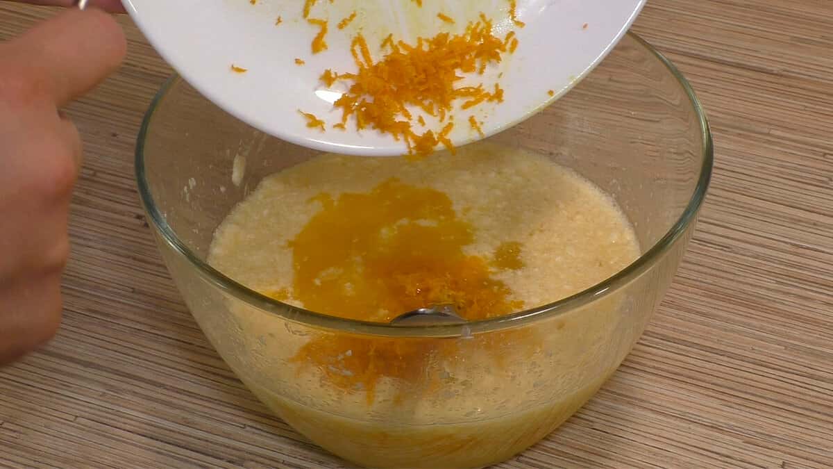 Додаємо туди 3 яйця і все перемішуємо. Вливаємо туди апельсиновий сік, викладаємо апельсинову цедру і знову все розмішуємо.